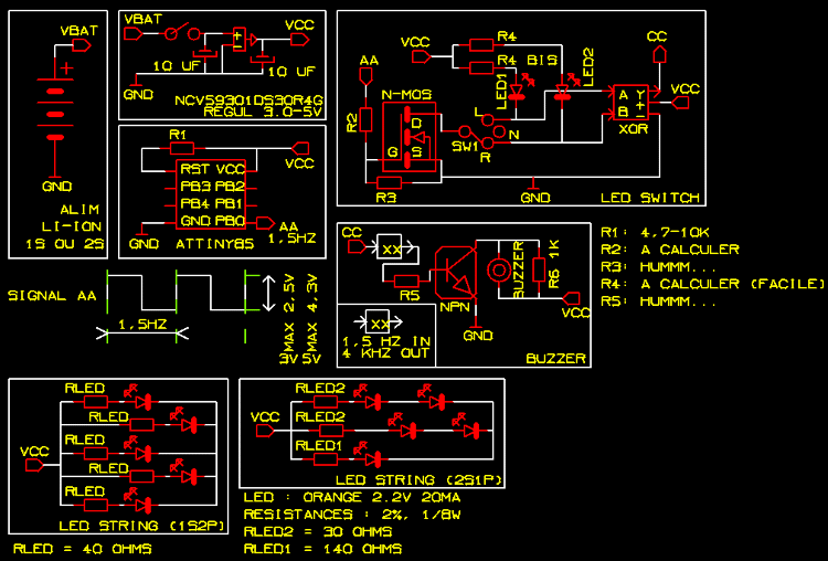 - les circuits de protection et de recharge des cellules Li-Ion ne sont pas représentés, et pour cause, il faut que je creuse le sujet... si vous avez une idée, je suis preneur.