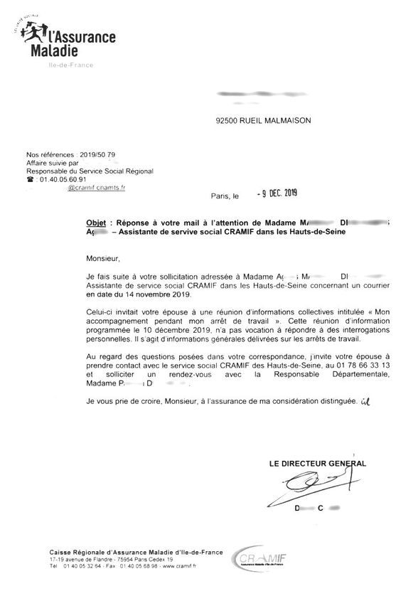 Un beau jour (façon de parler, c'était le 22/11/2019), réception d'une lettre de l'AM qui décide, de façon unilatérale, péremptoire et à l'insu du plein gré de mon épouse, que cette dernière est, et je cite parce que c'est du lourd, “'en arrêt de travail de plusieurs mois'” et, très généreusement, l'AM se propose de lui faire connaître tous ses droits et l'aider dans ses démarches lors d'une majestueuse réunion :