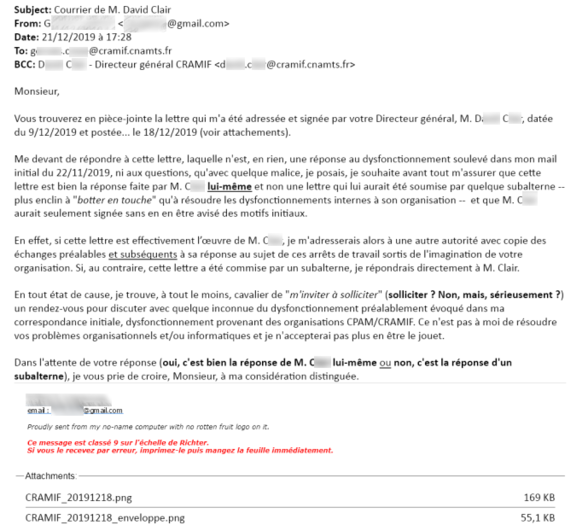 Une fois de plus, je réponds à l'auteur de cette missive avec, cette fois-ci, copie au Directeur général à la CPAM92. Bon, inutile de laisser planer le suspens plus longtemps : je n'ai jamais eu de réponse. Je sais, naïf un jour, naïf toujours, gna gna gna...
